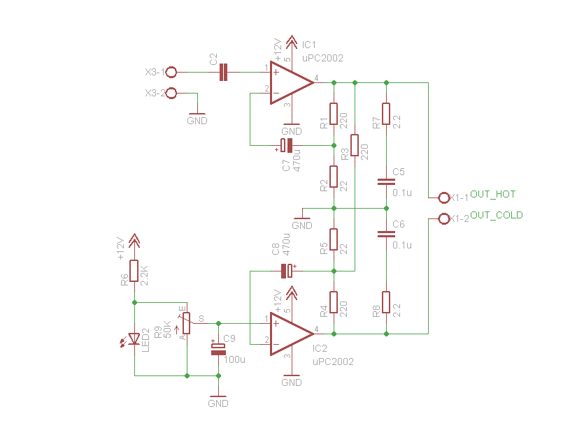 出力カップリングコンを入れたくないけど両電源化するのも面倒だったので片chに2個のuPC2002を使ってBTL動作するようにしてみました。