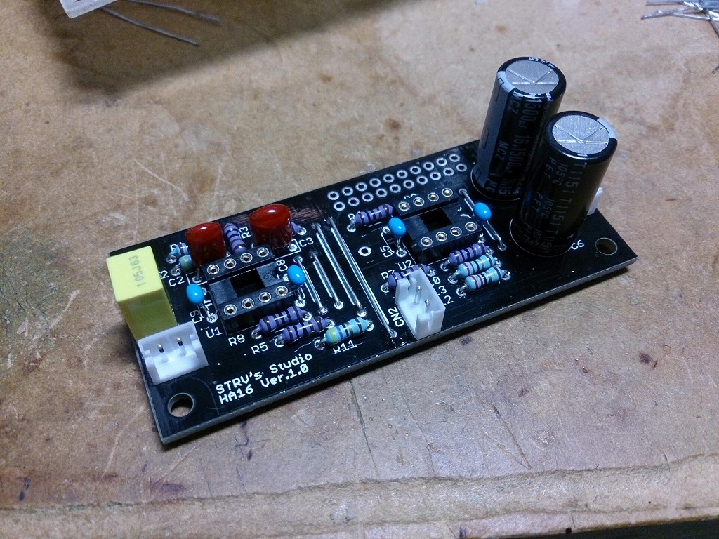 HA16はOPアンプを使ったヘッドホンアンプです。割りと普通な構成の回路ですが、定数などを詰めて、ひずみが少なくなるようにしてみました。なので、少しだけ抵抗が多めです。