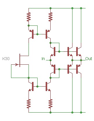 初段の負荷となるカレントミラーの電流値は2SK30のIdssと、抵抗値の比によって決まります。