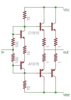 初段のエミッタ抵抗の値が10Ωになってますが、実際は100とかの方がいい。