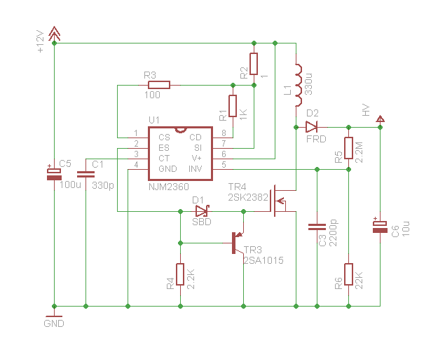 使ってるICはNJM2360Aで今更感もあるイニシエのデバイスですが,12V→125V昇圧で,1W時に70%程度の効率が出ています.実測で1.5Wくらいまでなら出力安定します.chanさんがトランスを使ったものを公開していますが,コアを手に入れるのがめんどくさいし,自分で巻くのもめんどくさいので,トランスを使わないで作ってみました.